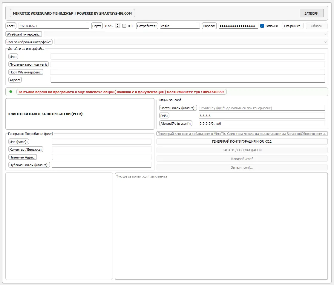 Чрез сигурна връзка към RouterOS API (с TLS по избор) то открива интерфейси, генерира клиентски ключове (X25519), добавя peer-и автоматично, предлага свободен клиентски IP и създава готов .conf файл плюс QR код за моментален импорт.